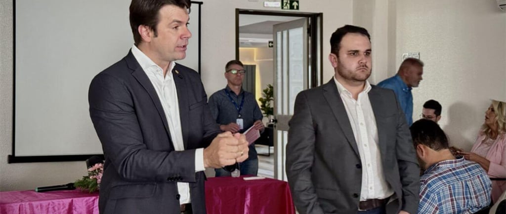 O líder da bancada do PP, deputado Marcus Vinícius Vieira de Almeida, conduziu a exposição ao lado do vereador camaquense Vitor Azambuja.